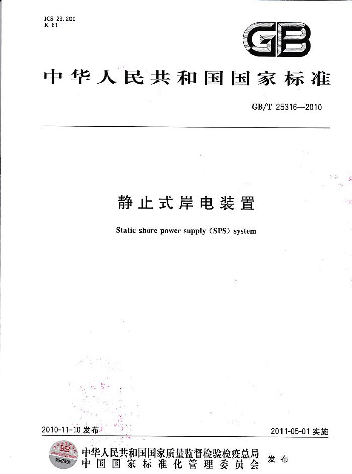 創(chuàng)統(tǒng)負責起草制訂GB/T25316《靜止式岸電裝置》